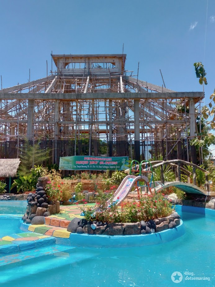 Di tengah panasnya suasana siang saat itu, kami terkejut jika di sini terdapat kolam renang. Yang berada di depan masjid seperti gambar yang terlihat, kolam renangnya diberikan pendopo di tengah-tengahnya.