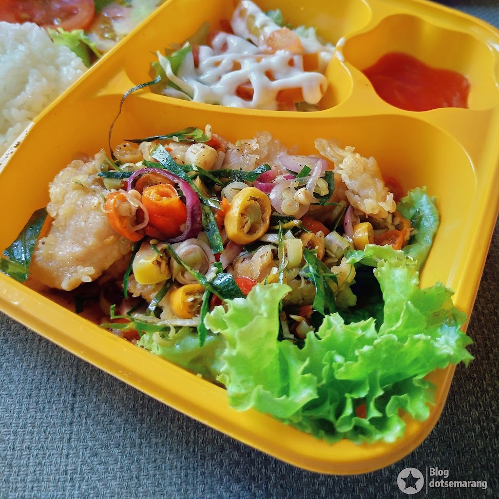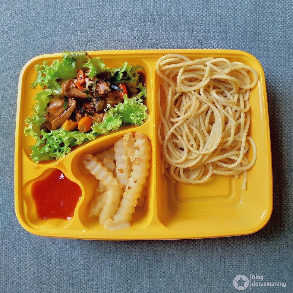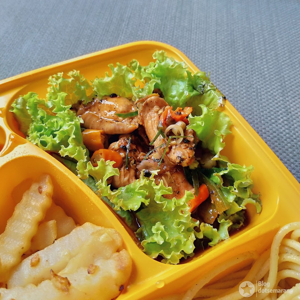Akhirnya bertemu dengan nasi. Dikemas dengan beraneka sayur dan saus, menu ini lebih ringan dari dua menu di atas. Yang penting enak sajalah. Cobaan deh.