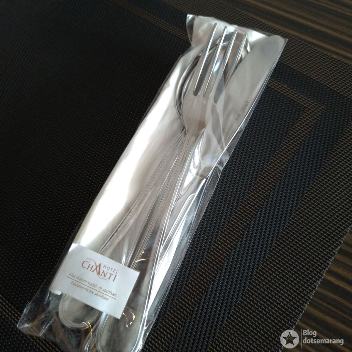 Peralatan makan pun juga dilindungi dengan dibungkus plastik. Tentu kamu yang sudah dicek suhu tubuh sebelum masuk hotel dan pakai handsanitizer yang melepas bungkusnya. Ingat saat makan, masker dibuka ya.
