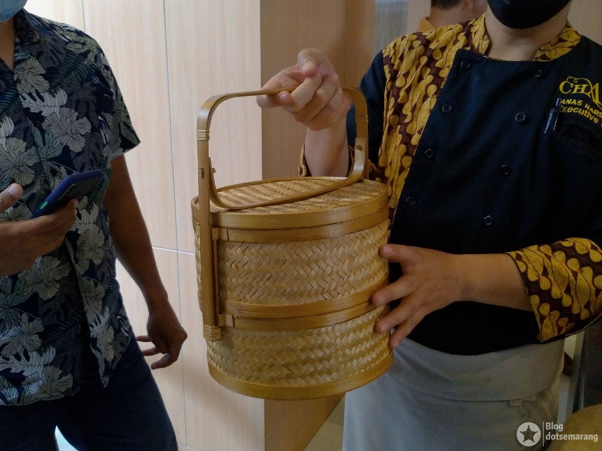 Mungkin kamu sudah memikirkan seperti apa bentuk rantangan. Namun rantangan yang dibuat oleh hotel lebih menarik karena dikemas dari anyaman semacam bambu. Lebih besar dan hanya ada 2 tempat dalam satu kemasan.