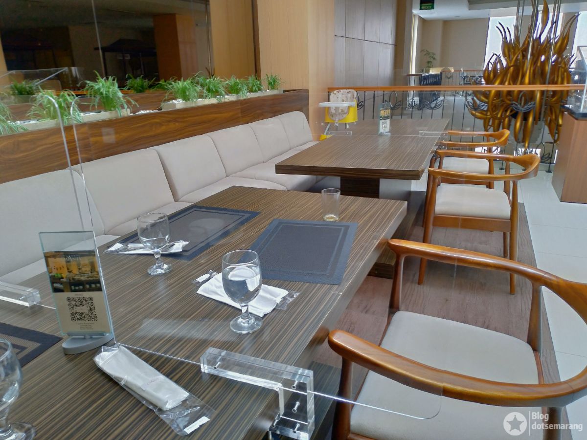 Beberapa meja, ada sekat yang terbuat dari kaca mika. Selain sebagai bagian protokol kesehatan juga, ini membuatmu lebih aman dan nyaman. Ruangan sendiri bisa menampung hingga 80-100 orang saja. Makanya pesan dari jauh-jauh hari.