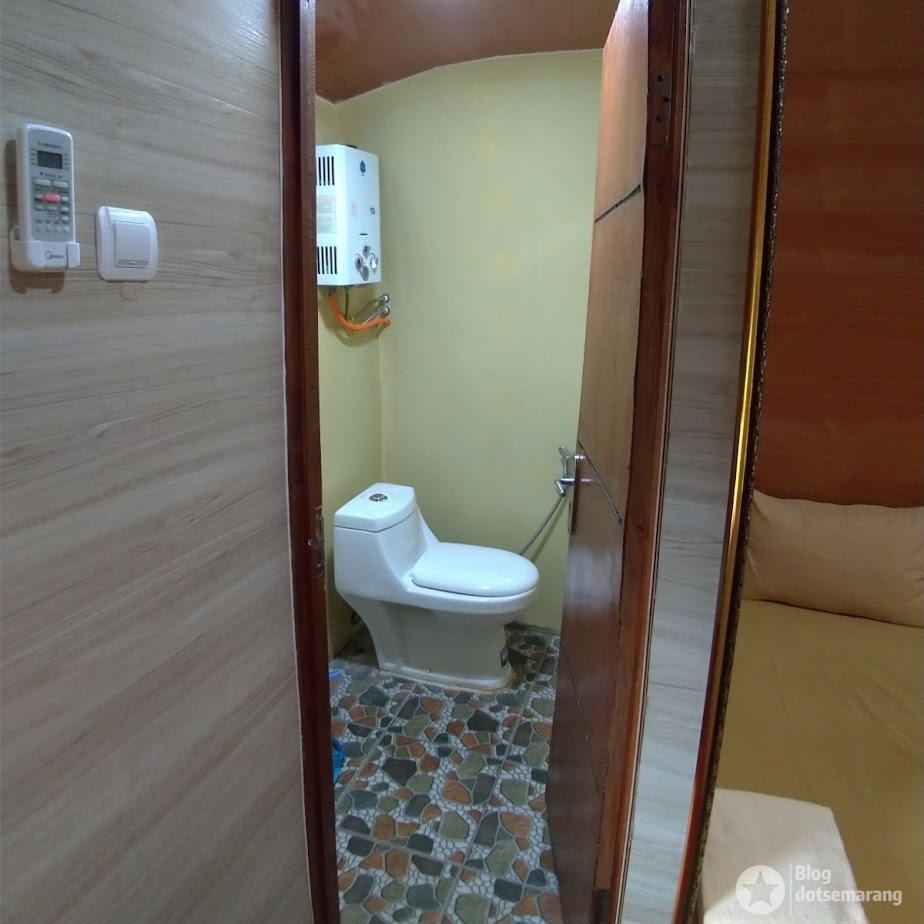 Seperti dilihat dalam gambar, atapnya melengkung. Di ujung mata memandang, ada AC terpasang. Bila ke sebelah kanan, ada satu pintu lagi yang mengarah ke kamar mandi. Toilet jongkok, alat pemanas, ember dan gayung.