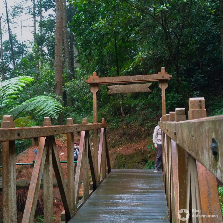 Sebuah jembatan lengkap dengan gerbang, plus tulisan jembatan cinta 1, menyapa kami untuk pertama kalinya. Lalu, kami beberapa meter melangkah, sisi kanan terlihat air terjun yang memiliki ketinggian 15 meter. Lama sekali kami tidak melihat air terjun.