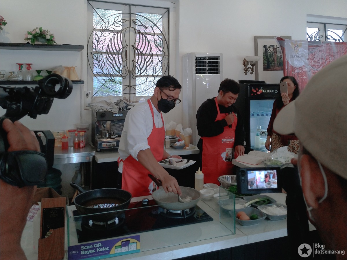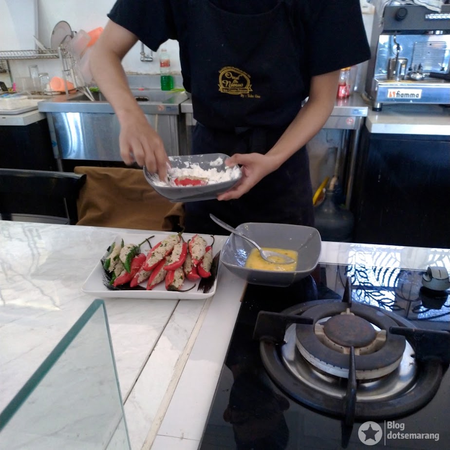 Saat Chef memasak, salah satu rekan kami yang juga bloger menemani dan membantu chef dengan menyebutkan bahan-bahan dari buku yang dipegangnya.