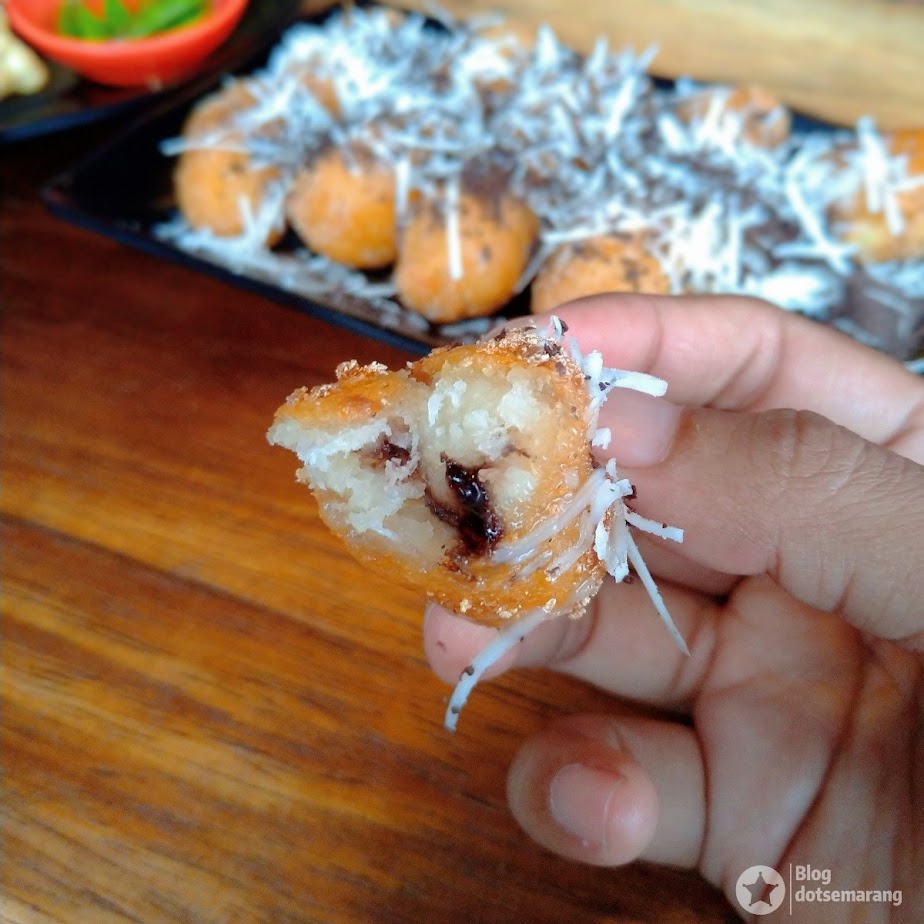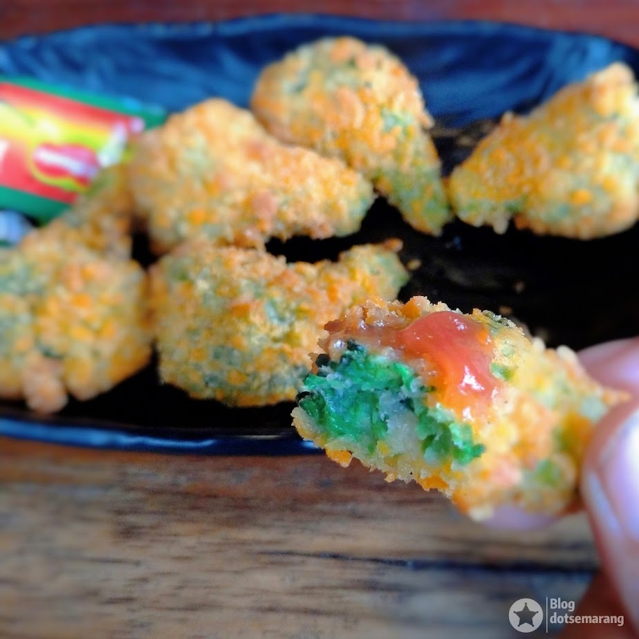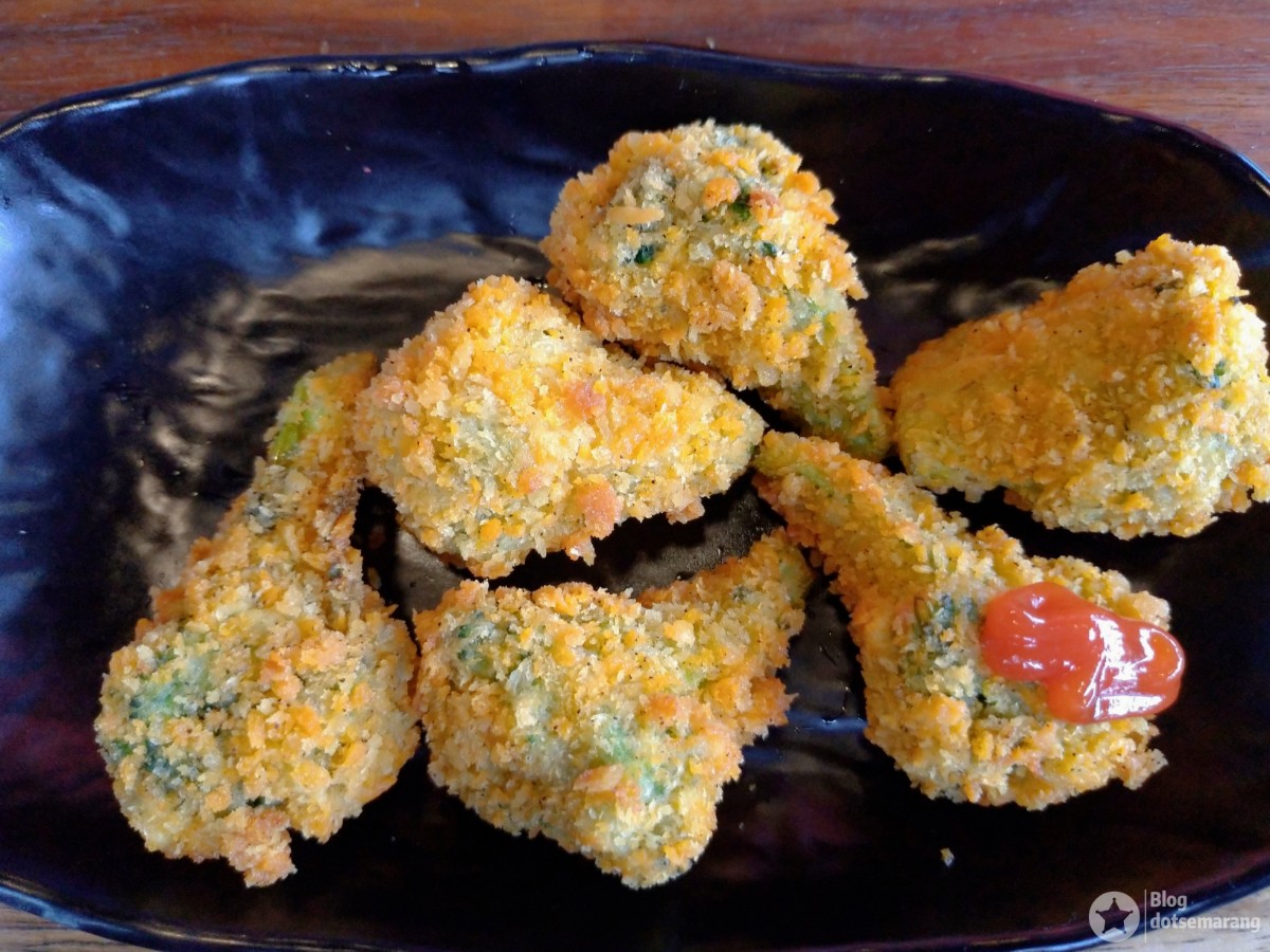 Koreksi kami jika salah. Gorengan yang mirip paha ayam ini, tapi ukurannya mini, saat kami makan dalamnya adalah sayur. Kami pikir itu brokoli. Ternyata bisa disajikan seperti itu ya. Dicocol dengan saus tomat pedas, wuih.. buat ngiler aja.