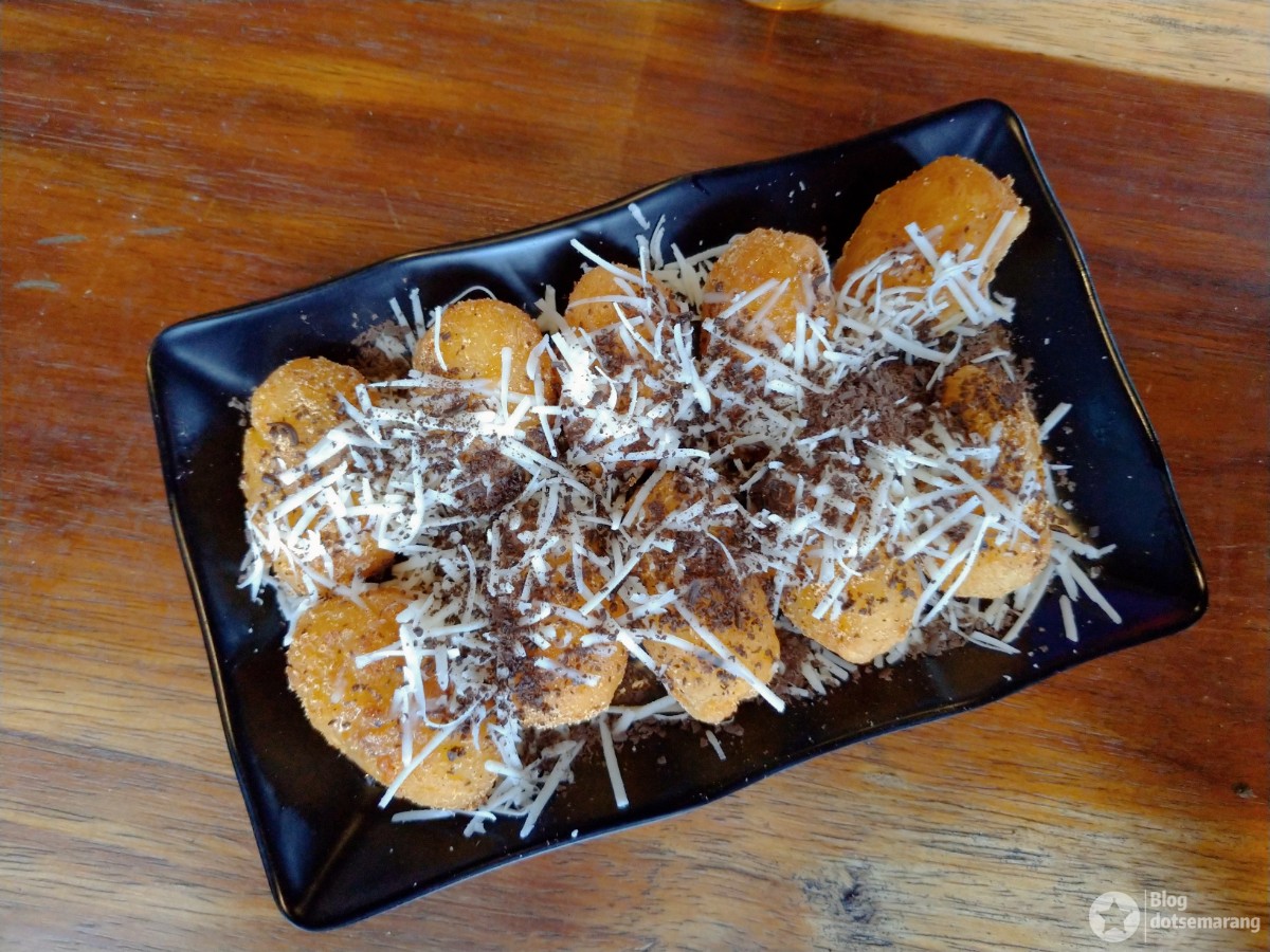 Buat nyemil, ada pisang keju cokelat yang satu porsinya ada 5 pisang di sana (gambar). Mumpung masih hangat, enak untuk disantap.