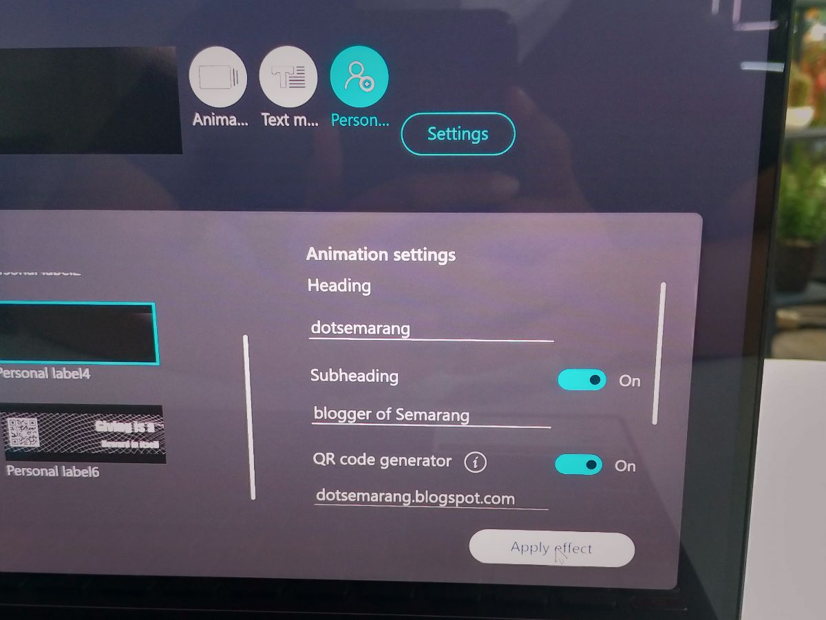 Pilihannya ada mode animasi, text dan personal. Yang ingin menampilkan citra atau branding, pilih 'Personal label'. Nantinya bisa diisi dengan nama hingga alamat blog yang kita miliki.