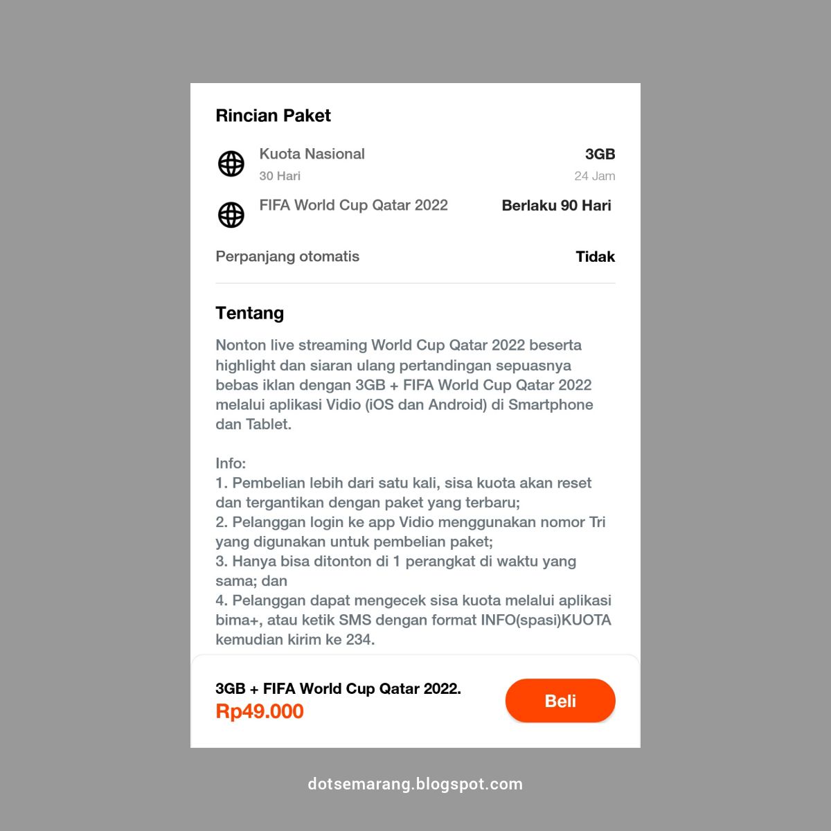 Harga paketnya cukup ramah di kantong, yaitu cuma 50 ribu atau 49 ribu (dibulatkan saja). Pelanggan akan mendapatkan benefit kuota sebesar 3GB dengan durasi wakt 30 hari dan dapat digunakan 24 jam.