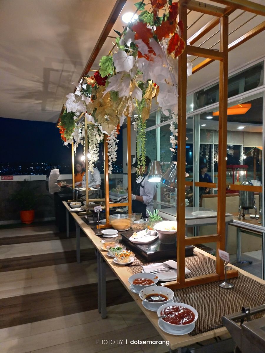 Yang membuat beda dari undangan hotel lainnya saat mengenalkan menu bukbernya adalah Harris Hotel Semarang ngadain acaranya dengan nuasa ala-ala kebun gitu. Semua meja dan kursi ditaruh di ruang terbuka dan ini di lantai 7. Menarik, yah.