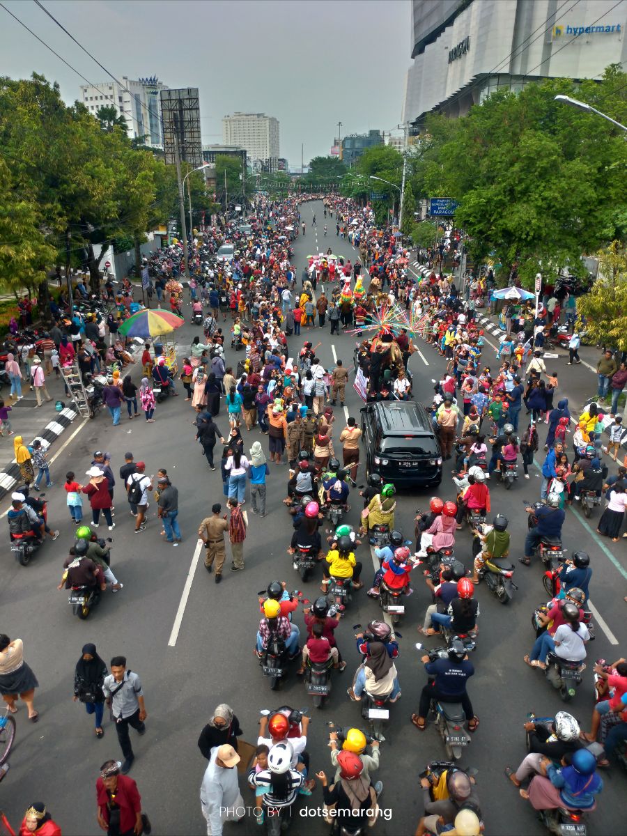Entah, apakah ini disebut beruntung atau memang kekuatan doa yang jadi penyemangat masyarakat untuk memenuhi ruas jalan Pemuda.