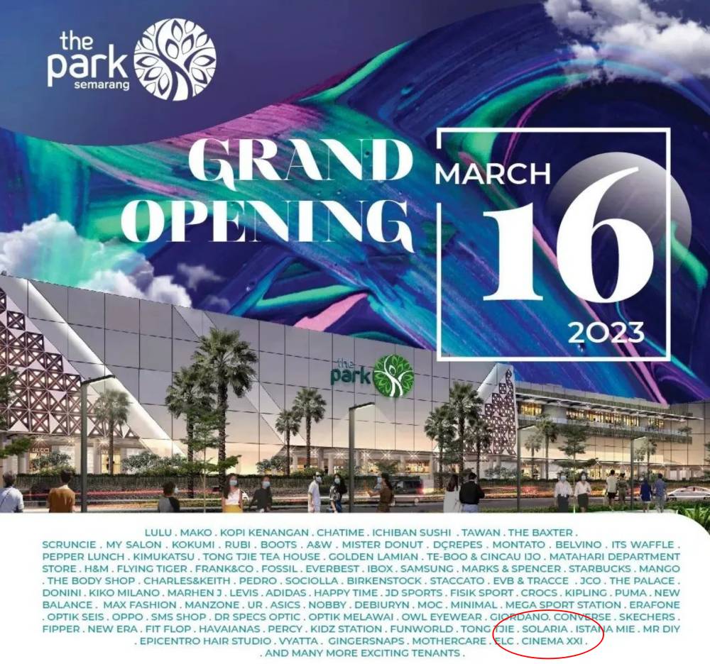 Akhirnya terkonfirmasi bahwa The Park Mall yang direncanakan buka tanggal 16 Maret membawa jaringan bioskop 21 ke dalam bangunan mal yang memiliki luas 90.000 meter persegi.